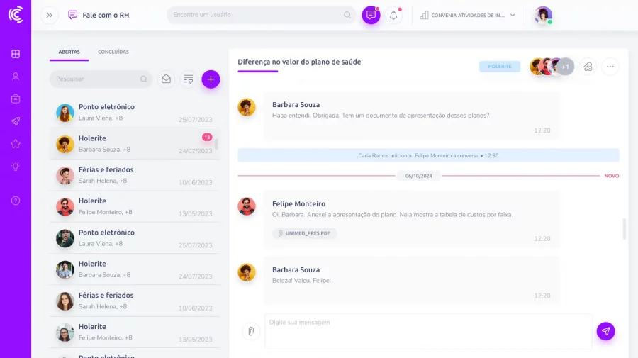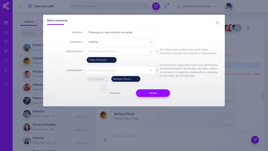 Crie conversas categorizadas no Fale com o RH, com participantes e responsáveis definidos para garantir agilidade e rastreabilidade