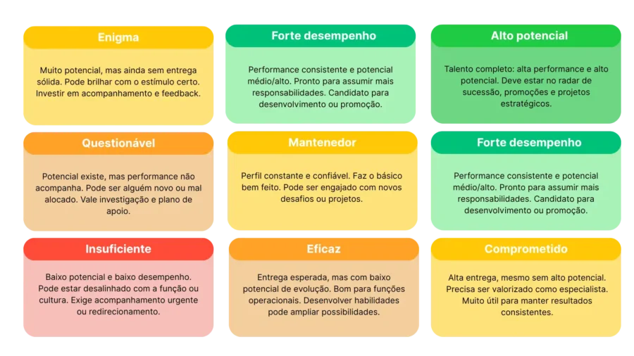 Os quadrantes da Matriz 9Box representam diferentes perfis de colaboradores, de acordo com seu nível de desempenho atual e seu potencial de crescimento futuro.