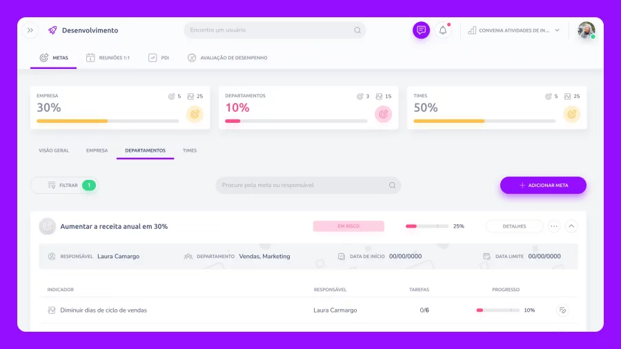 Mas esse papel não se limita ao apoio a outras áreas. Naturalmente, o próprio time de Gente e Gestão também deve desdobrar as metas globais da empresa em metas internas do setor, garantindo que suas iniciativas estejam diretamente conectadas aos objetivos estratégicos. Isso inclui definir metas claras para ações como recrutamento e seleção, onboarding, desenvolvimento de lideranças, engajamento e retenção, etc.